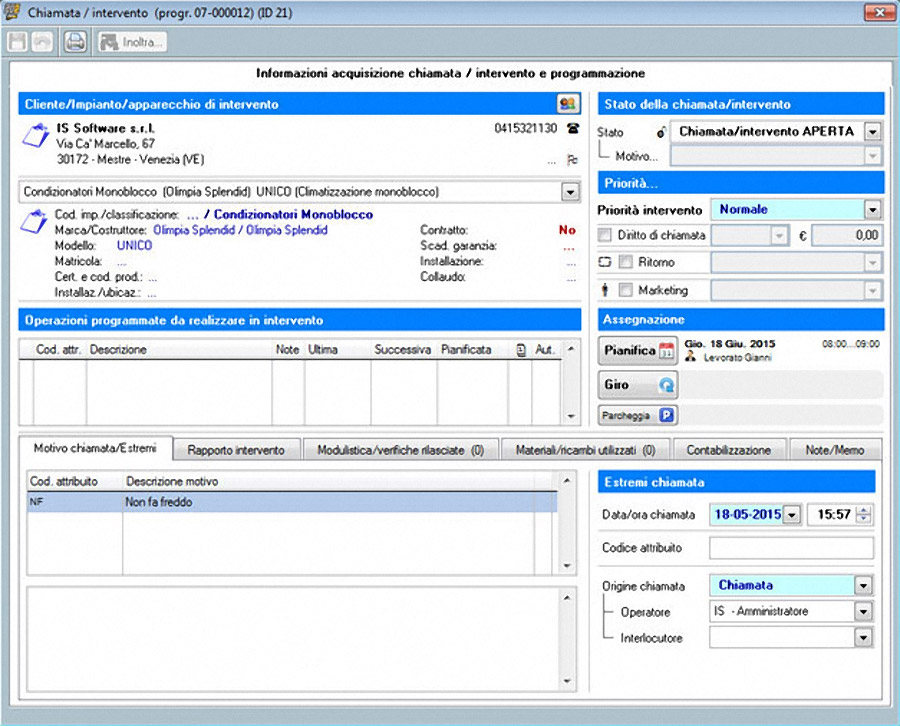 Gestione delle richieste di intervento e delle manutenzioni. Ricerca delle operazioni programmate scadute ed in scadenza. Agenda elettronica con visualizzazione settimanale e mensile. Pianificazione interventi su cartografia e indicazione del tempo di percorrenza in base viabilità. Visualizzazione su cartografia e in tempo reale del tecnico più vicino al cliente chiamante. -
