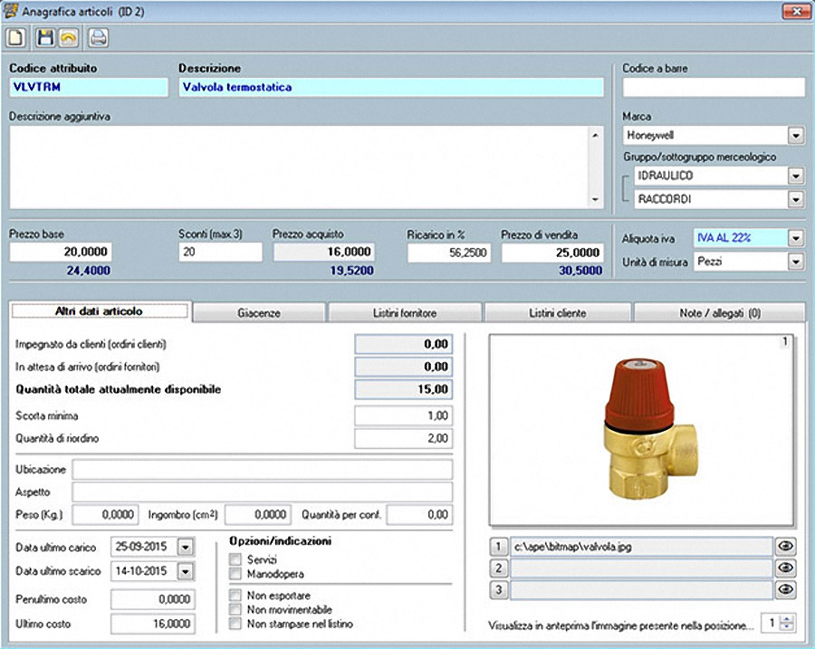 Anagrafica articoli di magazzino, giacenza e raggruppamento per gruppo di appartenenza. Listini fornitori. Gestione e giacenza su depositi fisici e furgoni. Gestione codici a barre e stampa etichette. Movimenti di carico, scarico, interni e DDT. ordine cliente e fornitore. Valorizzazione di magazzino e inventario di fine e metà anno. -